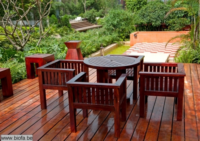 Pour l’entretien, une fine couche d’huile pour meubles de jardin sera appliquée et polie après l’avoir laissé pénétrer pendant environ une demi-heure.